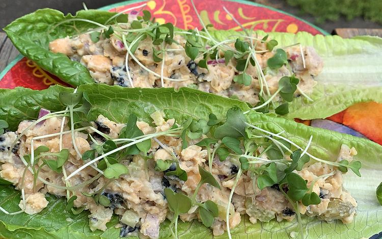 5. To serve the (No Tuna) Chickpea Salad, place it into lettuce leaves and serve with sliced tomatoes, if desired.